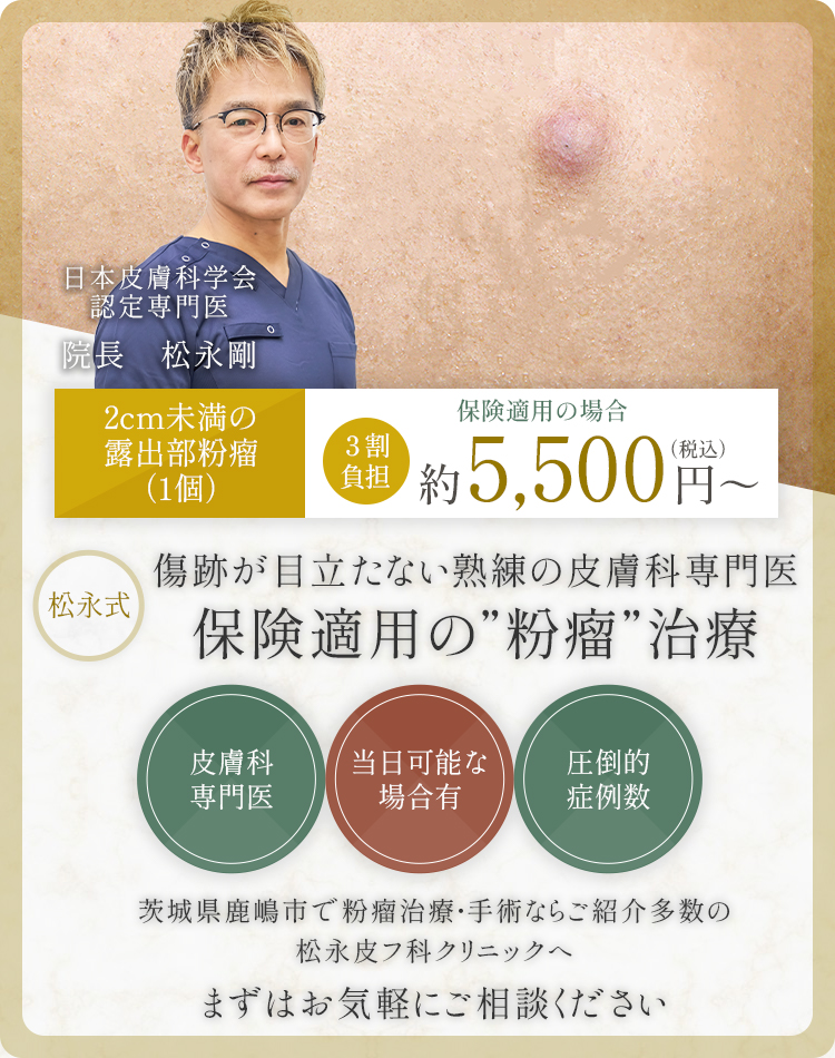A. 粉瘤の治療は保険適用となります。診療や検査、手術を含めて、一般的に10,000~15,000円ほどの費用負担です。
