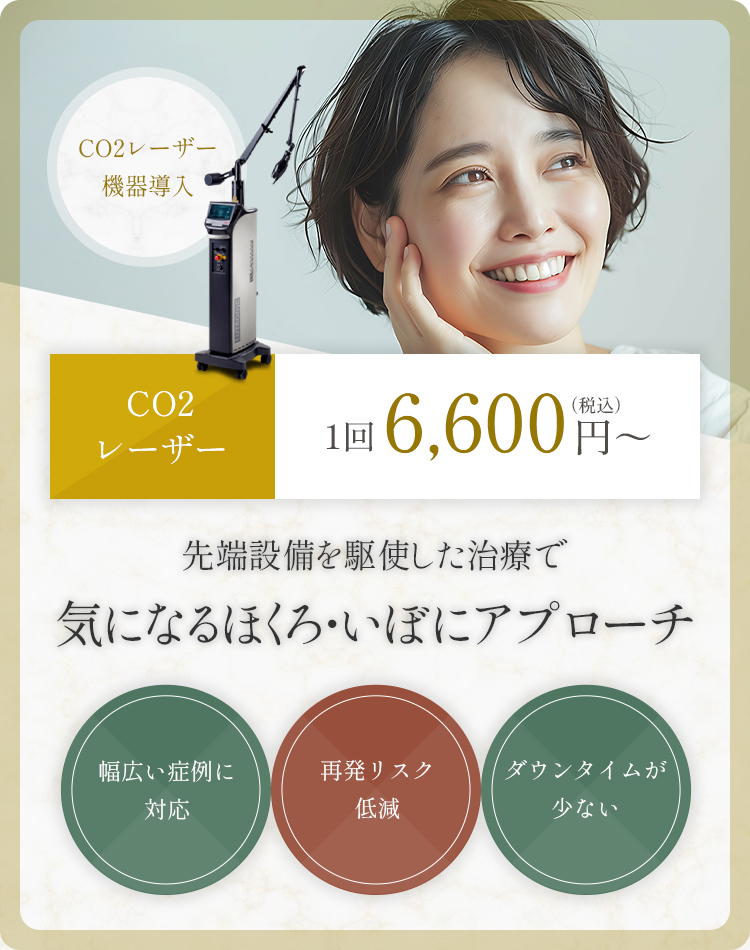 ほくろ治療において、当院ではCO2レーザーを使用して施術を行います。液体窒素を用いた施術と比較して予後の治りがきれいになる傾向にあり、かつミリ単位での調整が可能なため精度の高い治療を実現します。もしもほくろが再発してしまった場合、当院では1年以内であれば無料で施術ができますのでご安心ください。