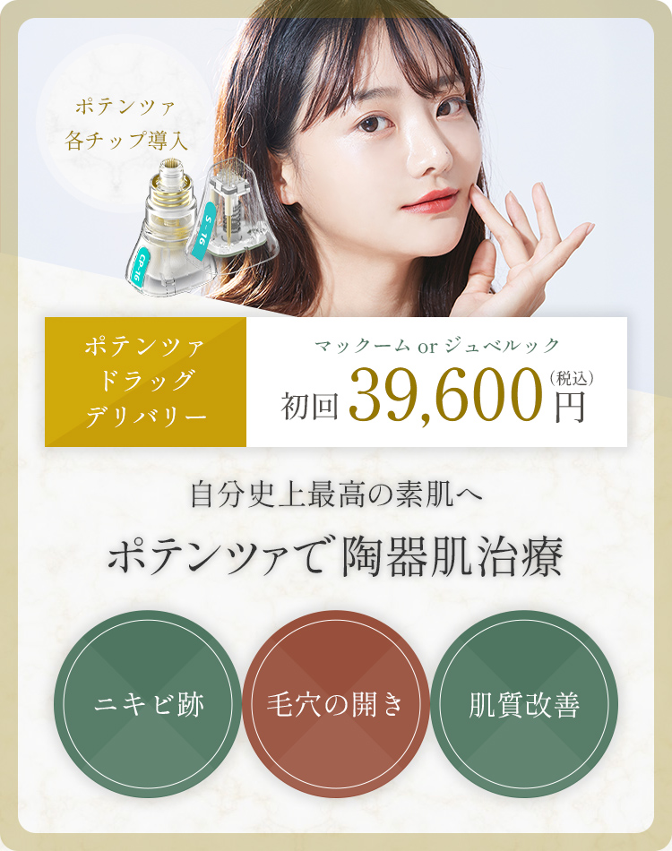 マックームとジュベルックという代表的な薬剤をご用意しております。陶器肌、ニキビ跡などに最適な薬剤を患者様とご相談の上、決定をさせて頂きます。