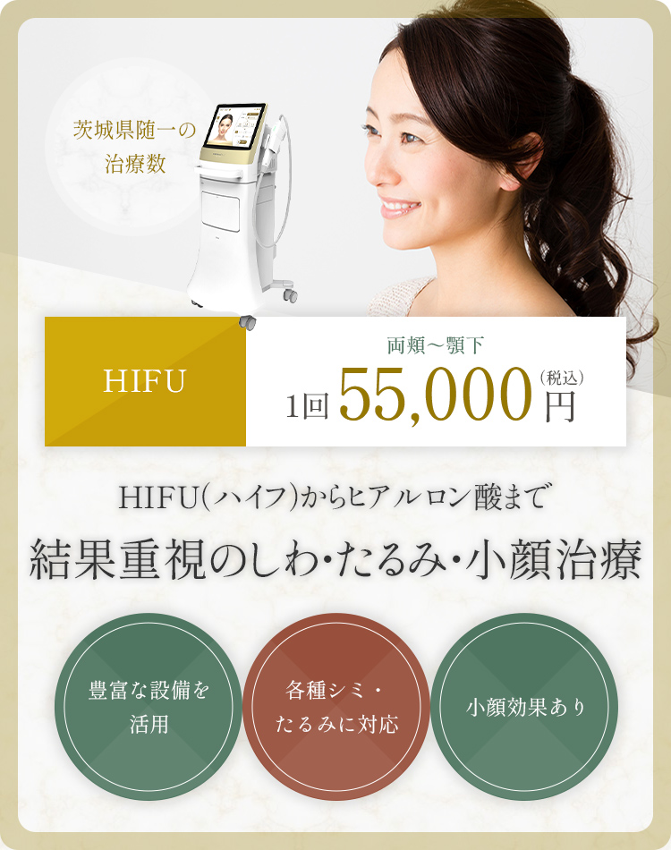 当院では、ザーフ、ウルセラZi(HIFU)やイントラジェン(RF)といった機器治療から、ヒアルロン酸、ボツリヌスなどの注入治療まで幅広くご用意。茨城県の皆さんに、ご自身に合った適切な治療計画をご提案します。