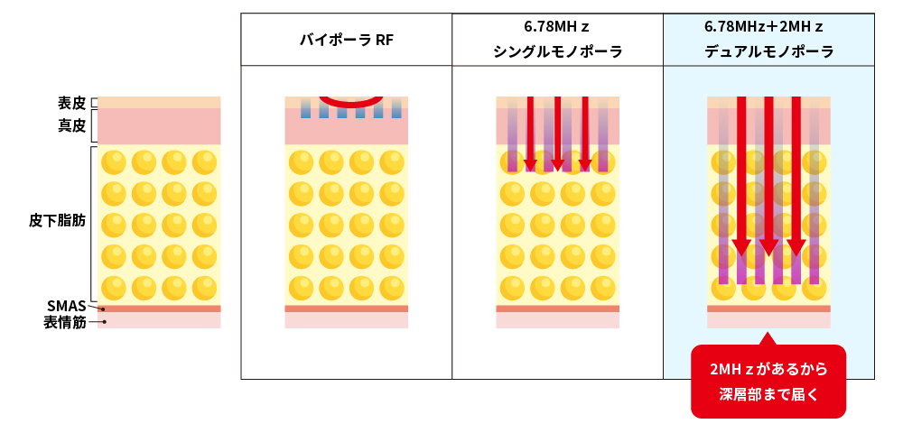 ①世界初!2 つの周波数同時照射で、皮膚の深層と浅層にアプローチ